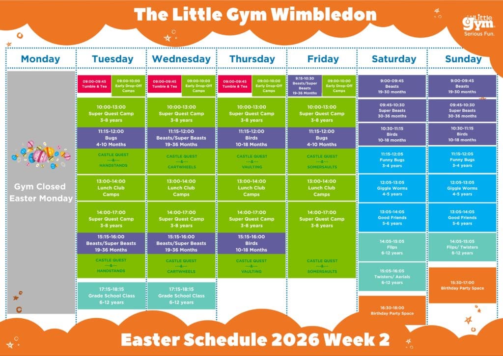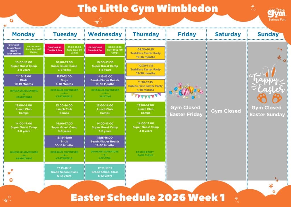 The Little Gym Wimbledon’s Easter Holiday Camps are back, and the perfect way for children to burn energy, make new friends and have a whole lot of fun whilst developing motor, cognitive, social & emotional skills through play.